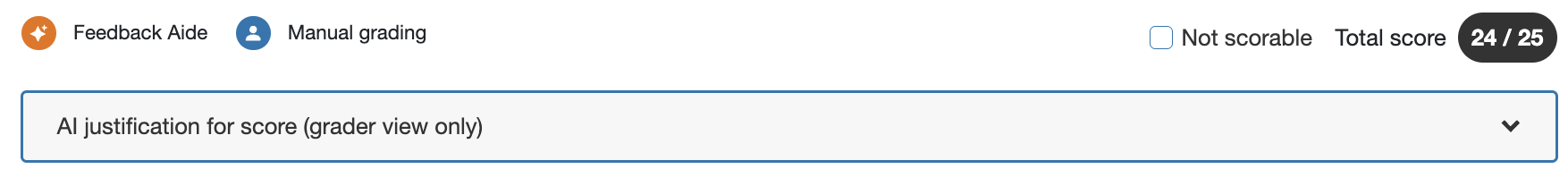 Justification provides graders and reviewers with a short explanation of why Feedback Aide assigned each score. Unlike learner-facing feedback, this justification text is intended specifically for internal scoring workflows. It helps reviewers quickly understand the Feedback Aide engine’s reasoning so they can confidently approve or adjust the score.