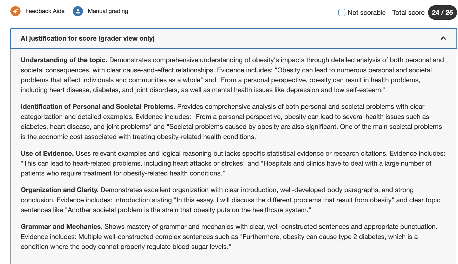 - Better explainability: Annotations give graders insight into why the Feedback Aide engine suggested the given score.