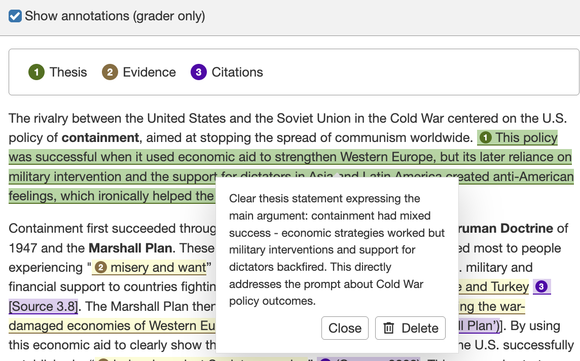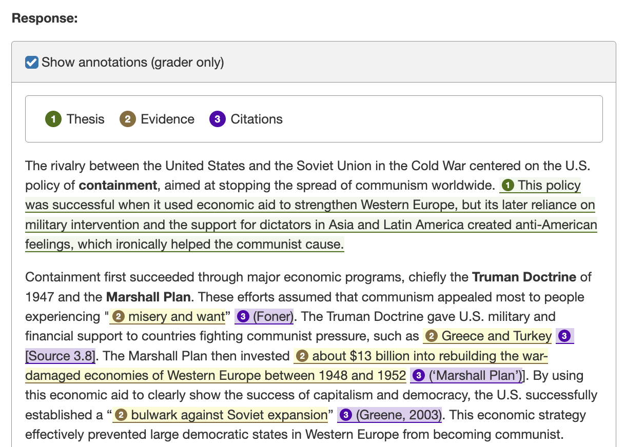 - Faster grading: Graders can immediately locate the thesis, check for relevant evidence, and confirm citations without reading the entire response or scrolling between sections of the essay.
