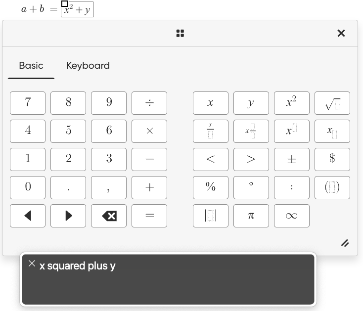 When end users enter math symbols via the keypad in math response Questions, Learnosity uses the proprietary spokenmath to dynamically generate assistive content as the user types. Our keypad produces content marked up in the LaTeX markup language. As each symbol is entered, the LaTeX is converted to plain text and updated to an ARIA live announcement giving the user a spoken indication of what they have entered.
